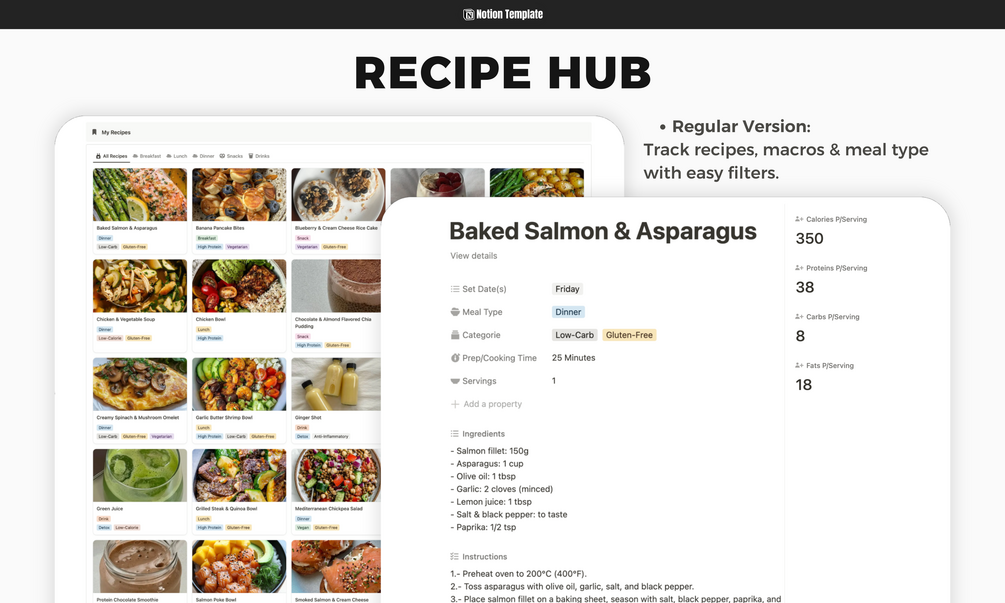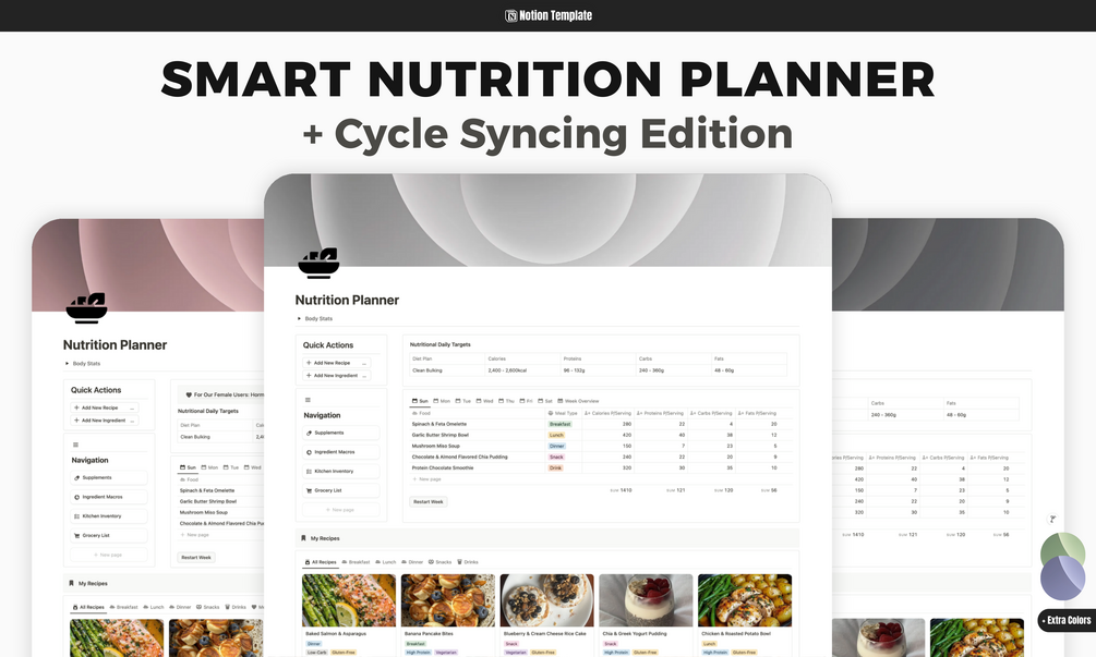 Take control of your health with a sleek, intuitive, and distraction-free Notion template designed to make meal planning, macro tracking, and nutrition management effortless. Whether you're optimizing your diet for fitness goals or syncing your meals with your menstrual cycle, this planner adapts to your needs.